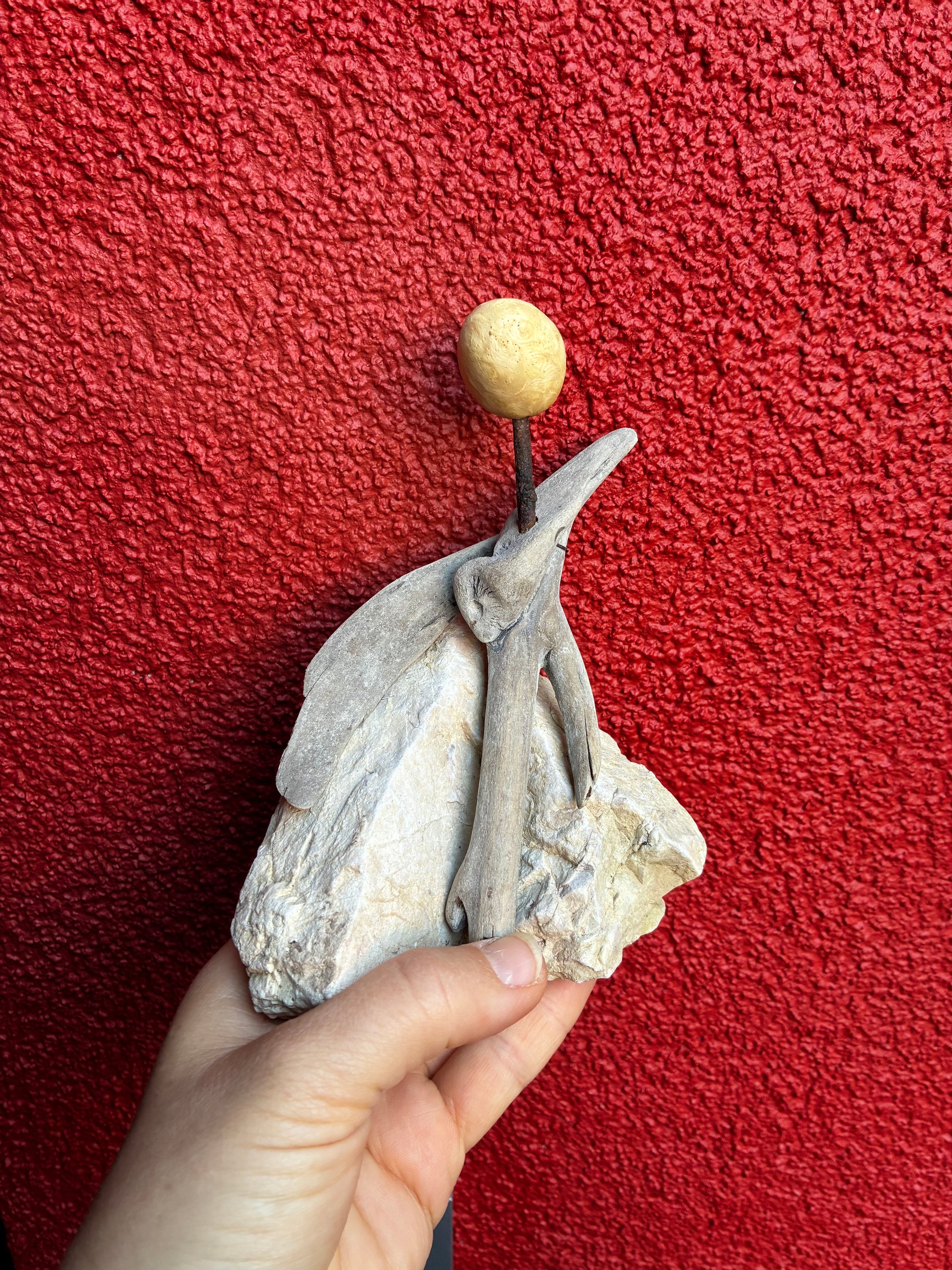 - Skulptur mit Baumperlenkopf einer Fichte, Schwemmholz, Eisen (Stein nicht inbegriffen) rechter Flügel beweglich