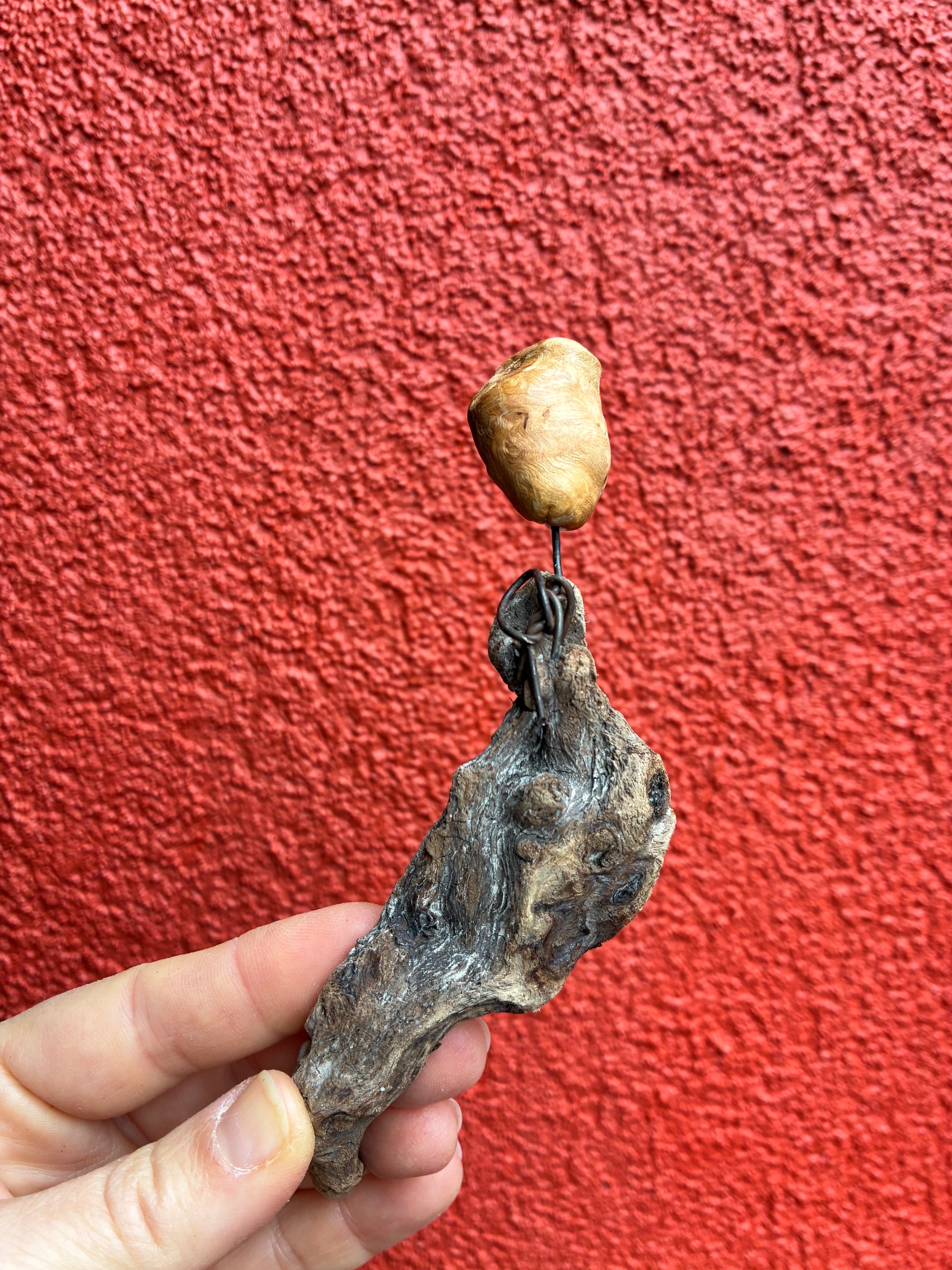 - Skulptur mit Baumperlenkopf, Schwemmholz, Eisen gewickelt